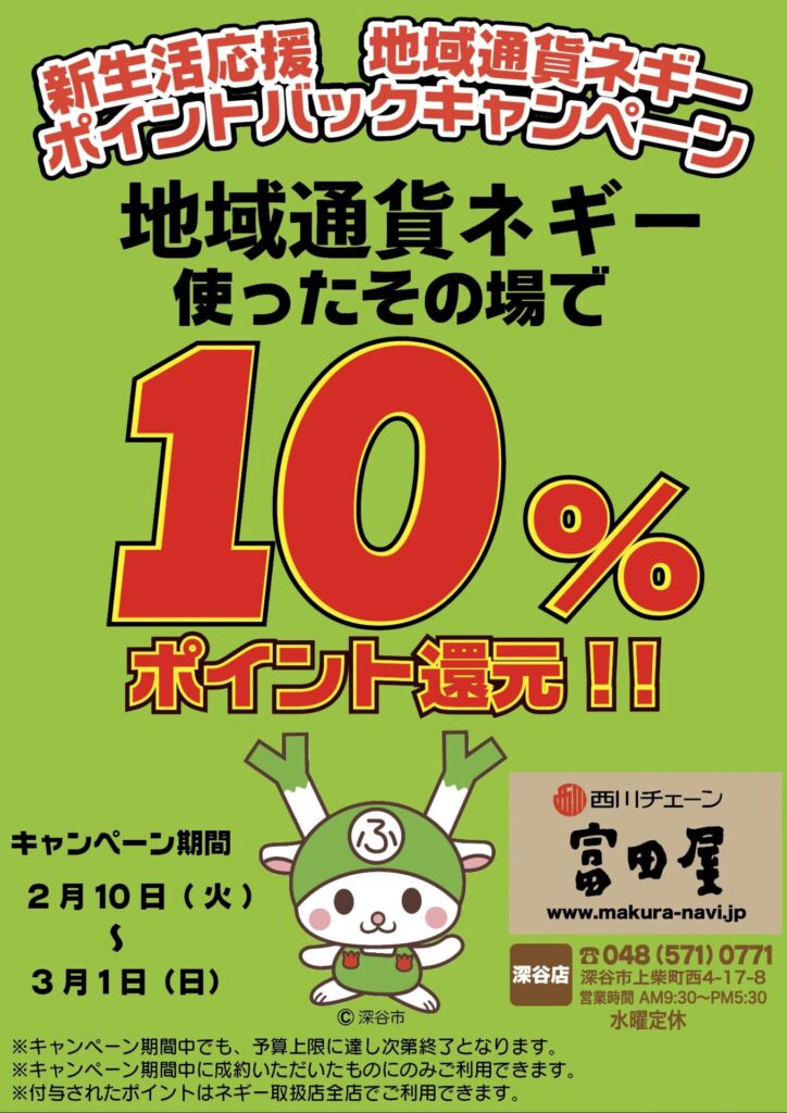 地域通貨ネギー10%還元 新生活応援キャンペーンの開催